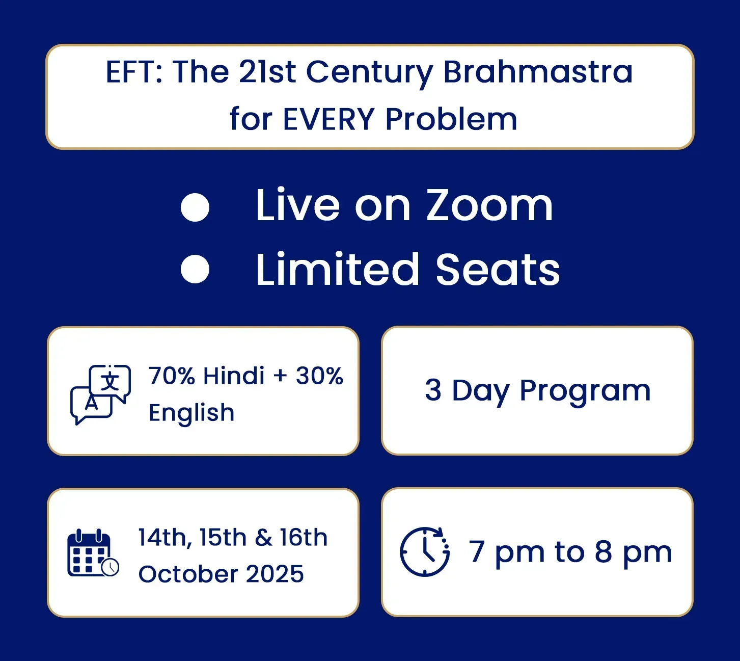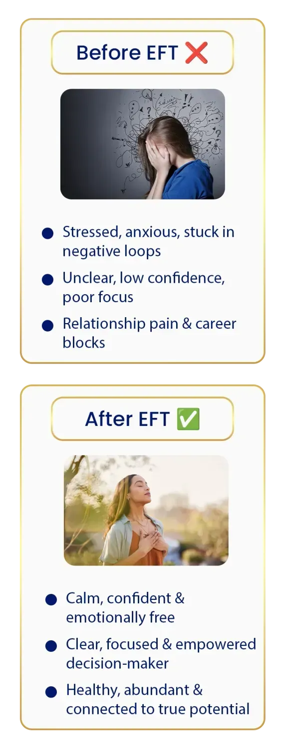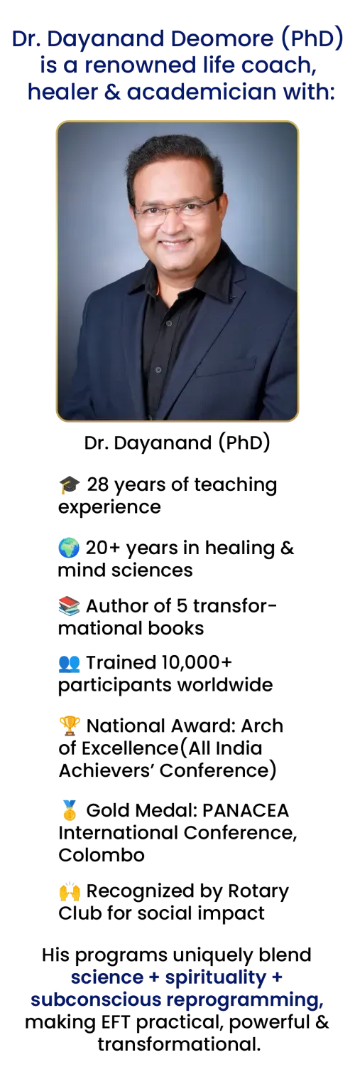 3 Days. 1 Hour Daily. Learn the Powerful Emotional Freedom Technique (EFT) to dissolve stress, anxiety, emotional blocks & even physical pain – directly guided by Dr. Dayanand (PhD).